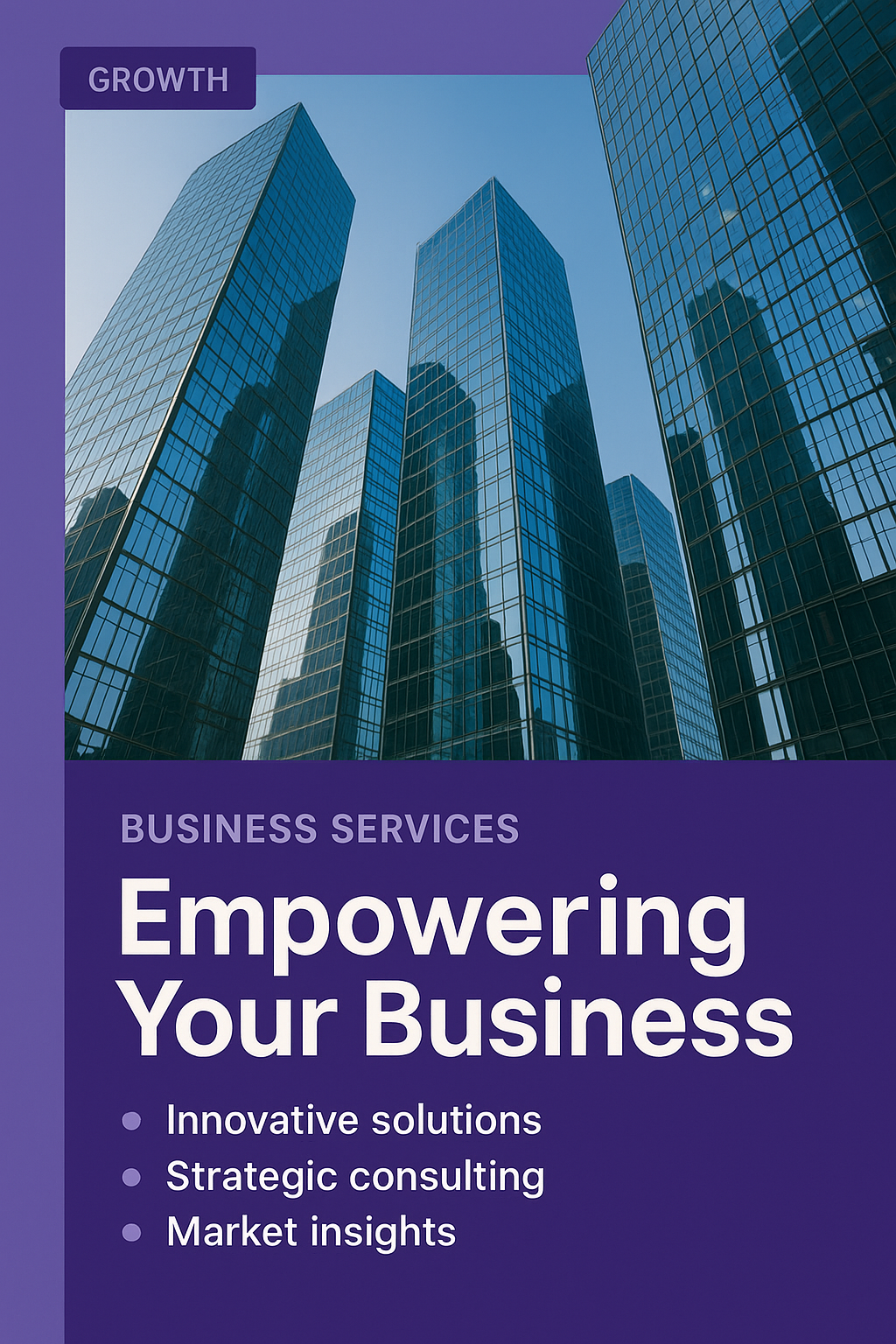 /Collection: /by davooda/Type: PNG/A modern promotional graphic showcasing business services focused on empowering growth. The design features tall glass buildings, conveying innovation and professionalism, suitable for corporate marketing.