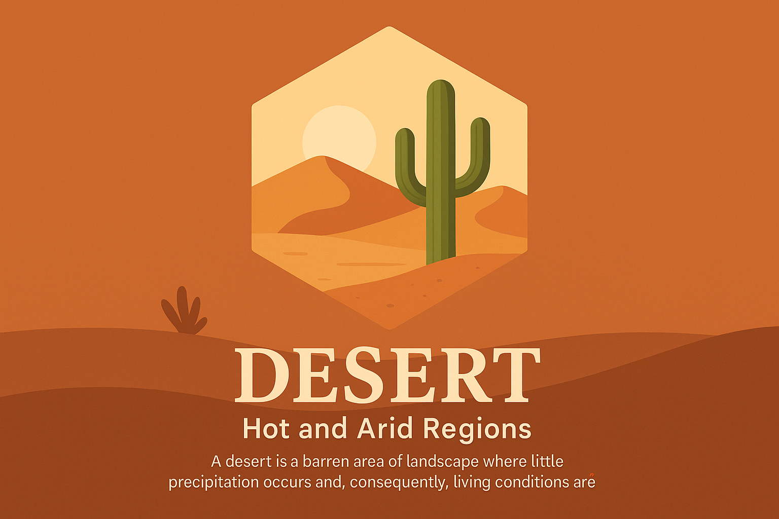 A stylized desert scene featuring geometric shapes and text. The background showcases a gradient sunset with cacti and hills, emphasizing a hot and arid environment.