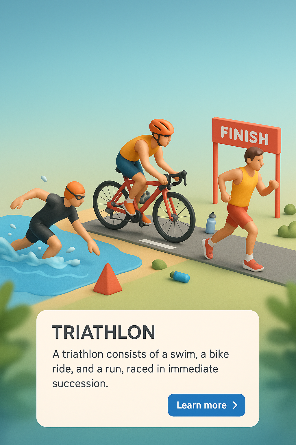 /Collection: /by davooda/Type: PNG/A detailed 3D illustration depicting a triathlon scene with athletes swimming, cycling, and running towards the finish line. Features a gradient background and informative text.