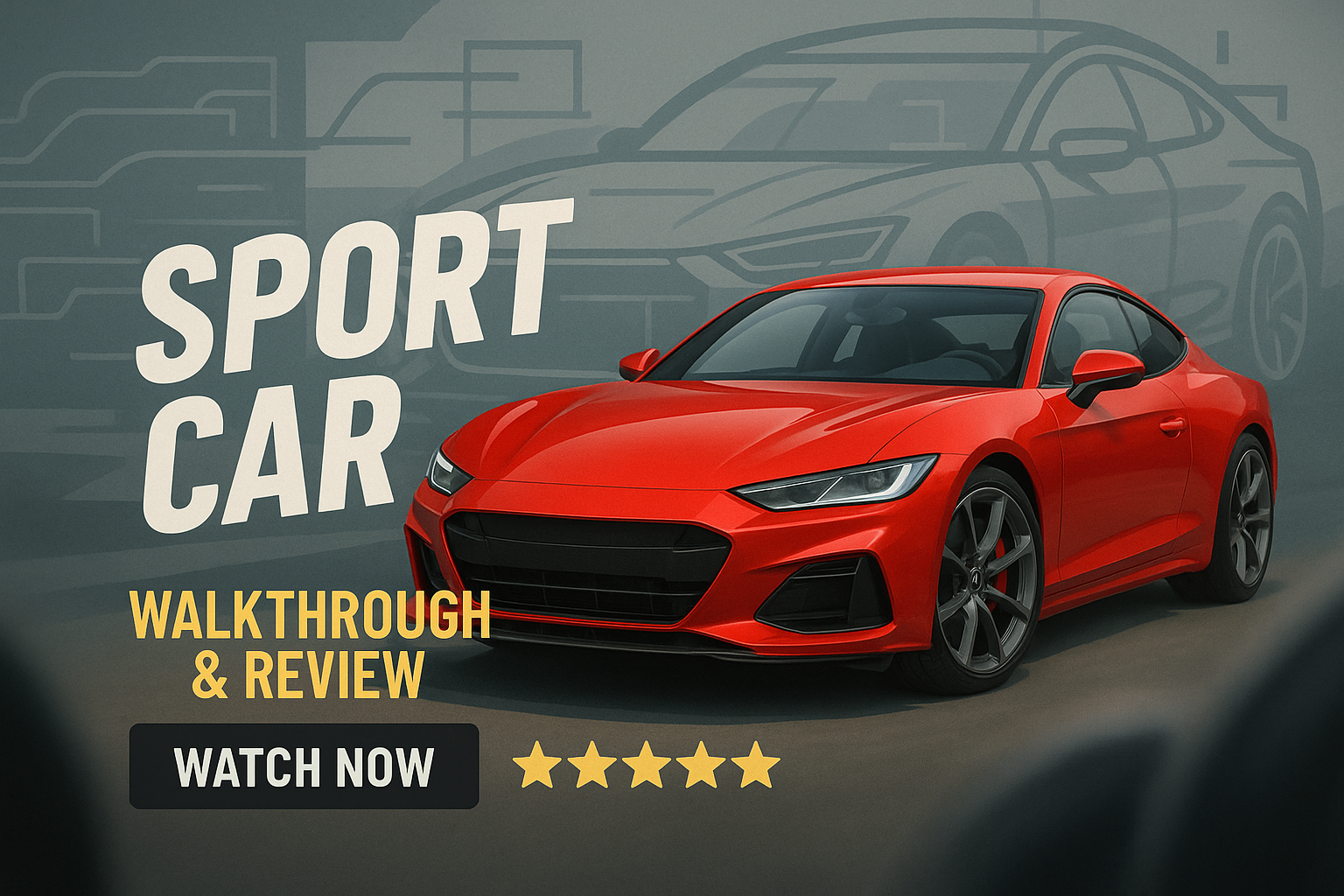 Dynamic promotional graphic designed for a sports car walkthrough and review, featuring a striking red car against a minimalist background. Ideal for automotive content marketing.