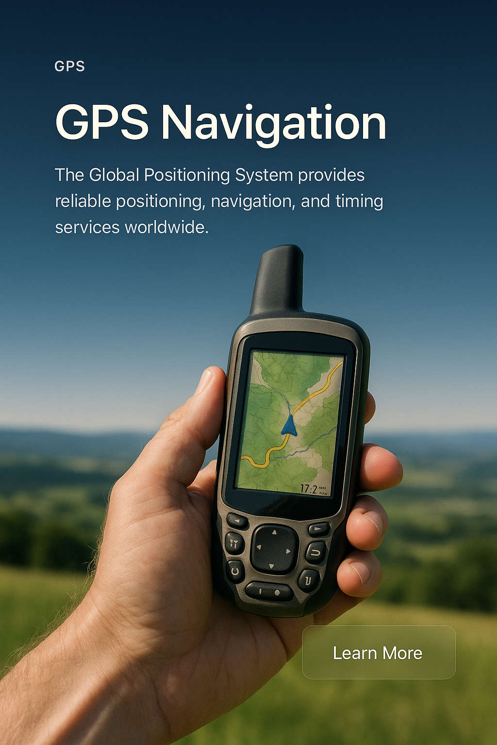 A stylish web design showcasing a GPS device held in hand, displaying a map. The background features a scenic landscape, emphasizing functionality and readability.