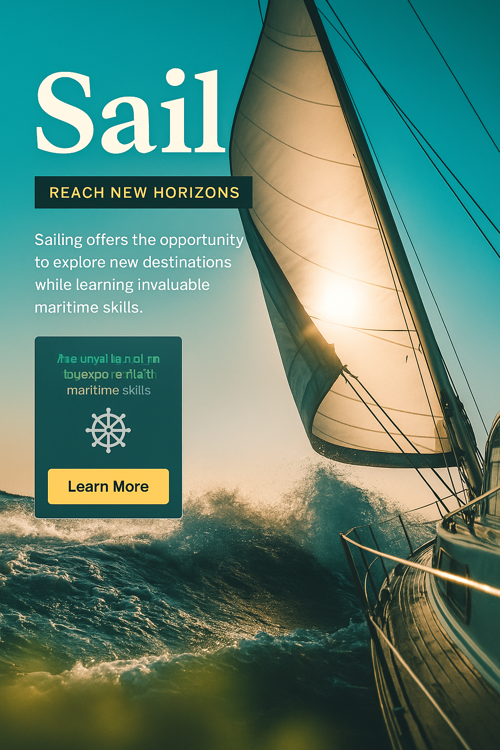 A visually striking depiction of sailing, featuring a bright background, dynamic angles, and a call to action. The sailboat is illuminated by backlighting, enhancing the adventurous theme.