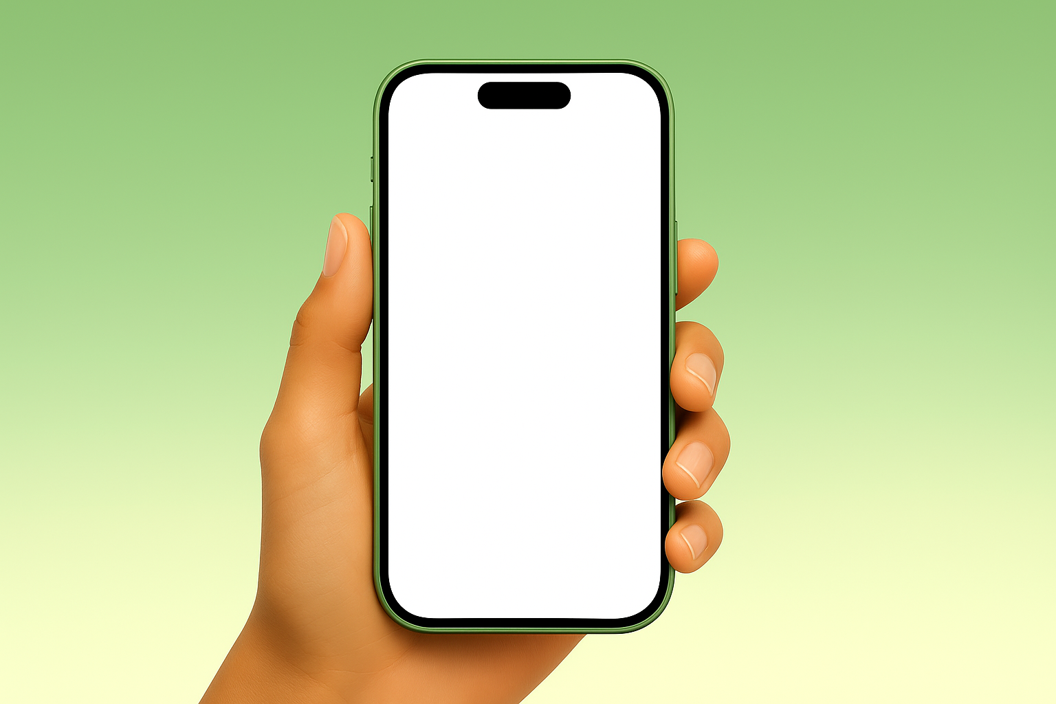 A green smartphone is held vertically in the center of a soft gradient background. The screen is blank and white, enhancing the phone's sleek design.
