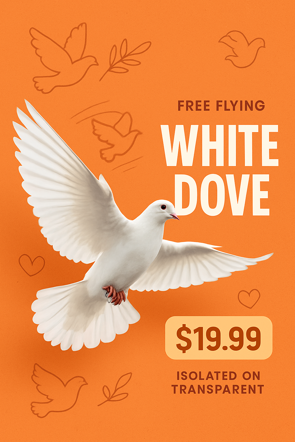 /Collection: /by davooda/Type: PNG/This advertisement showcases a free-flying white dove against an orange background with light textures and simple contour drawings. Bold typography highlights the product details.