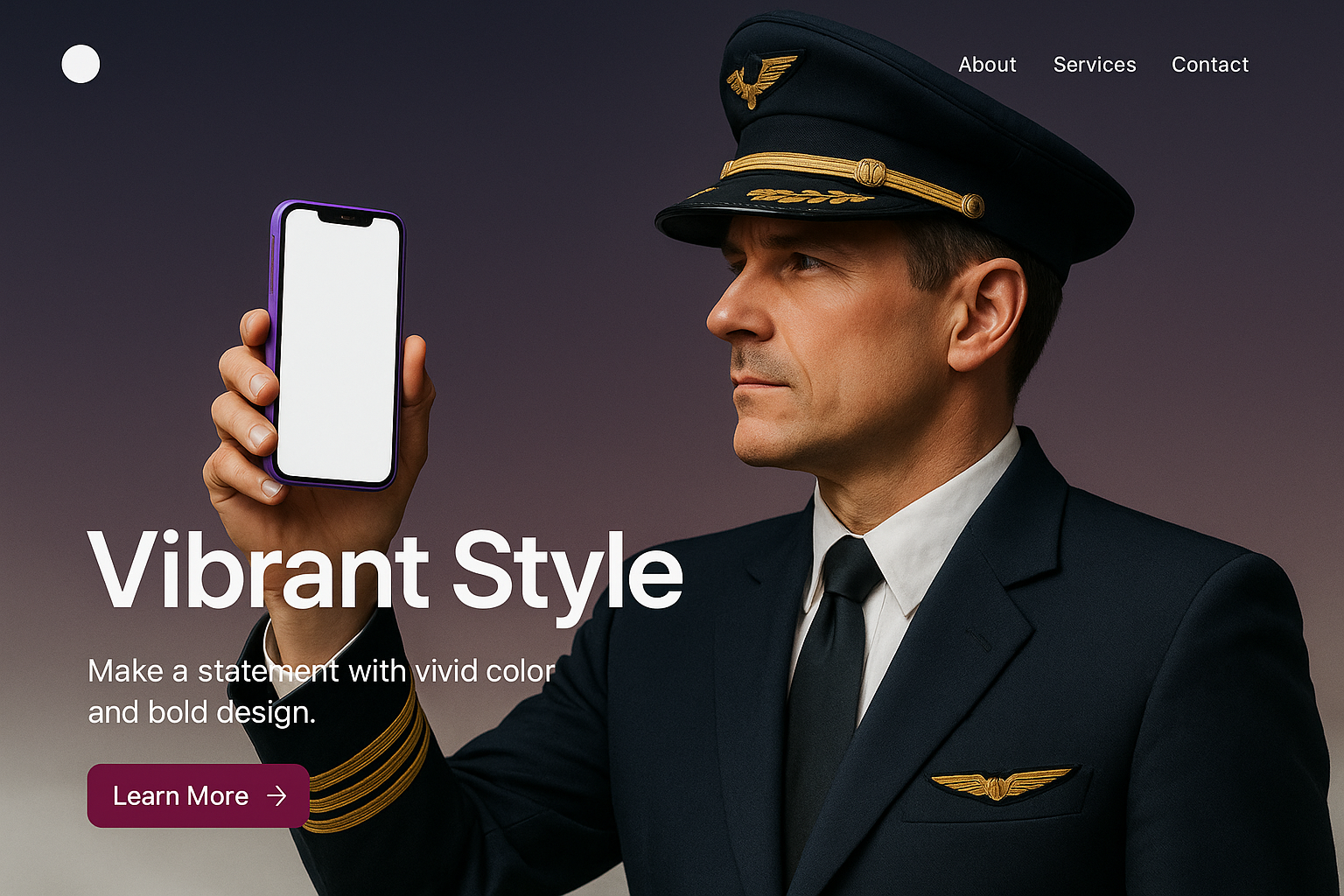 A pilot in uniform holds a purple phone, showcasing a vibrant background with a gradient. The scene highlights aviation themes with a modern design.