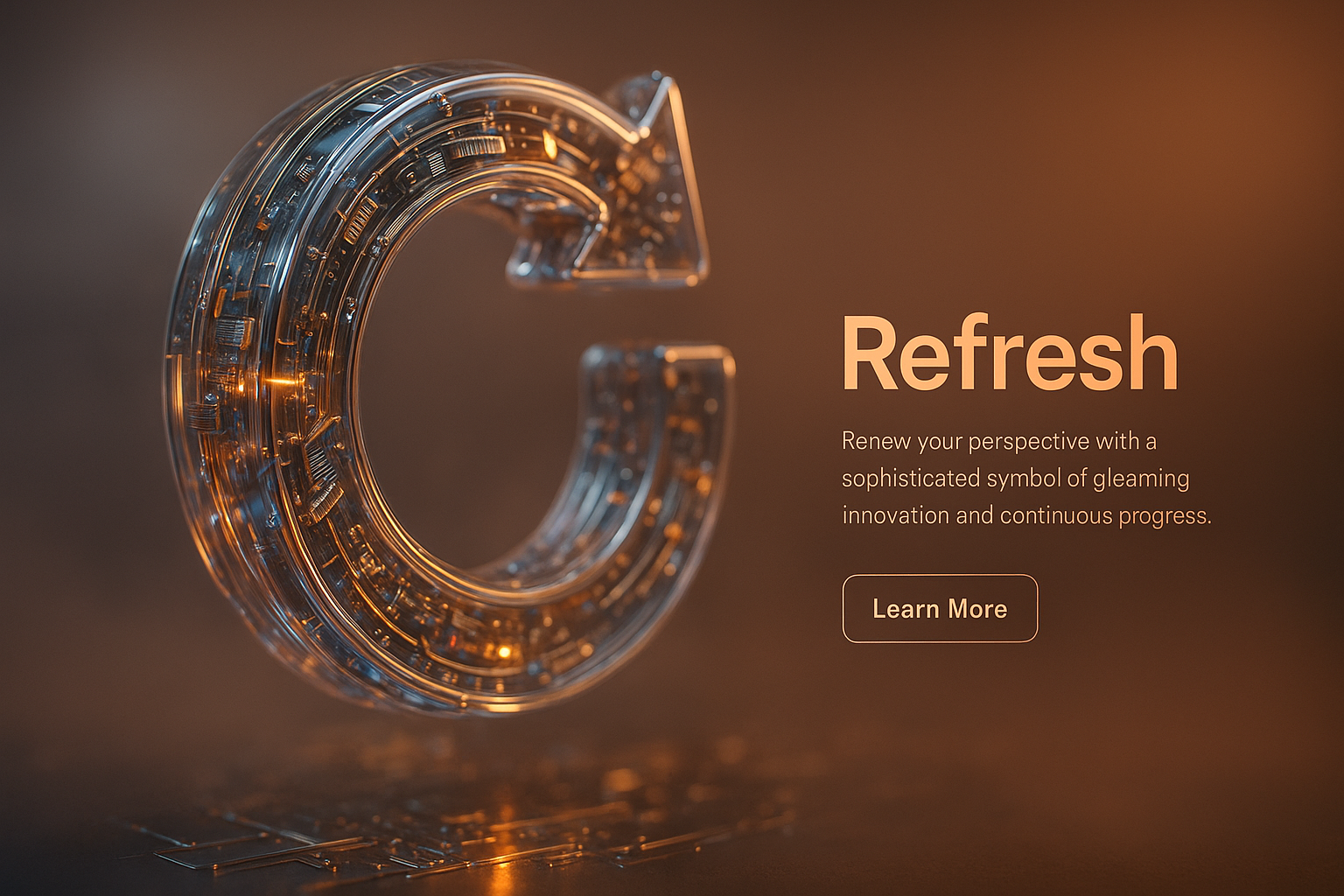 /Collection: /by davooda/Type: PNG/This hyperrealistic 3D scene captures a clear, glass-like polymer structure shaped like a refresh symbol, showcasing an intricate inner world with glowing LEDs and mechanical filaments. The ambient lighting enhances its metallic sheen.