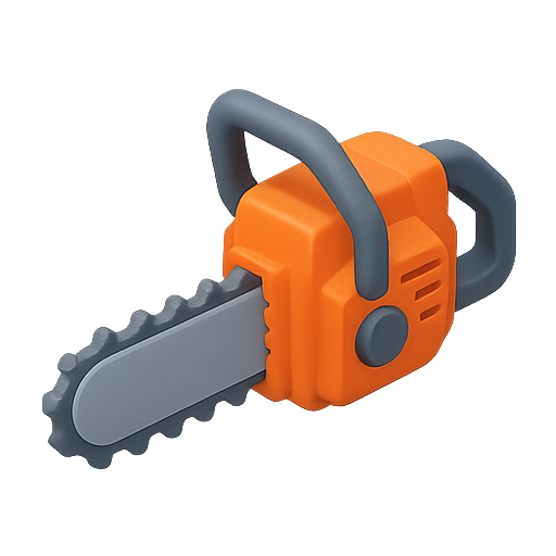 A 3D-rendered chainsaw icon featuring vibrant orange and gray colors, perfect for applications related to construction, outdoor activities, or tool-related content.