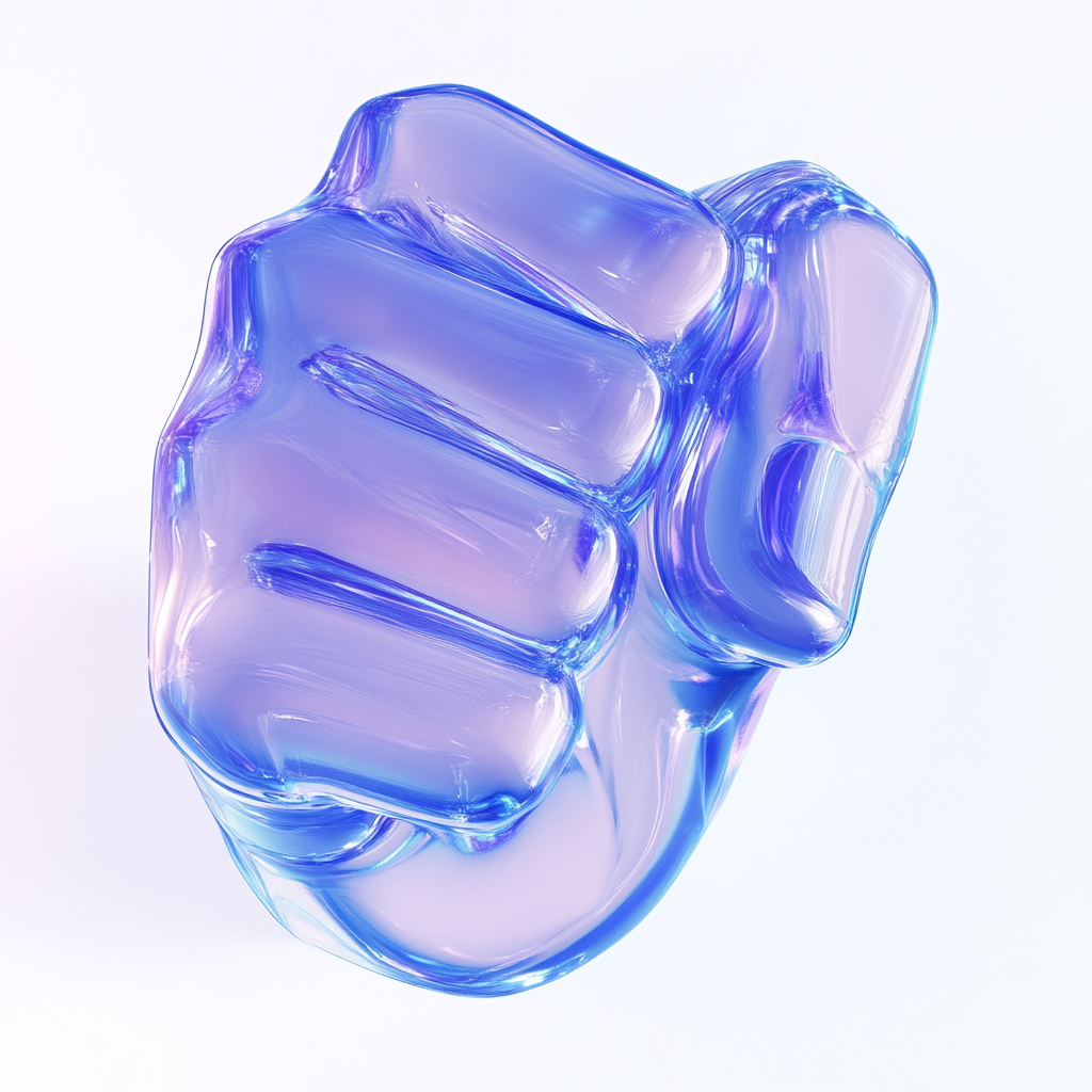 A modern 3D rendering of a glass fist sculpture showcasing a smooth, translucent design in shades of blue, ideal for contemporary art displays or digital media.