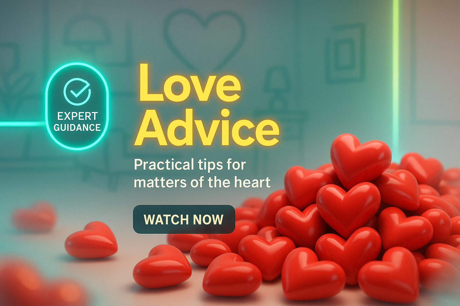 A vibrant promotional graphic featuring a pile of red hearts, conveying expert guidance on love. Ideal for online content focused on relationship tips.