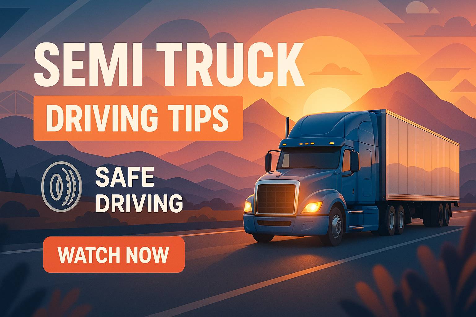 /Collection: /by davooda/Type: PNG/A visually engaging graphic featuring a semi truck with a sunset backdrop, providing driving tips. Ideal for educational content aimed at truck drivers and safety awareness.