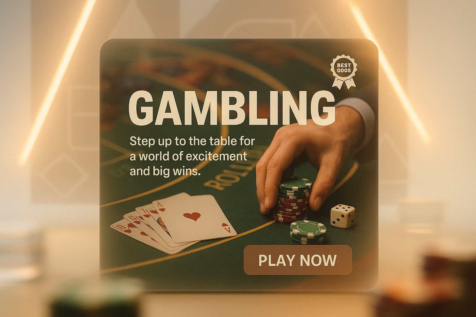 /Collection: /by davooda/Type: PNG/Vibrant promotional graphic inviting players to experience gambling excitement, featuring a hand at a table with cards and chips. Ideal for online casino marketing.