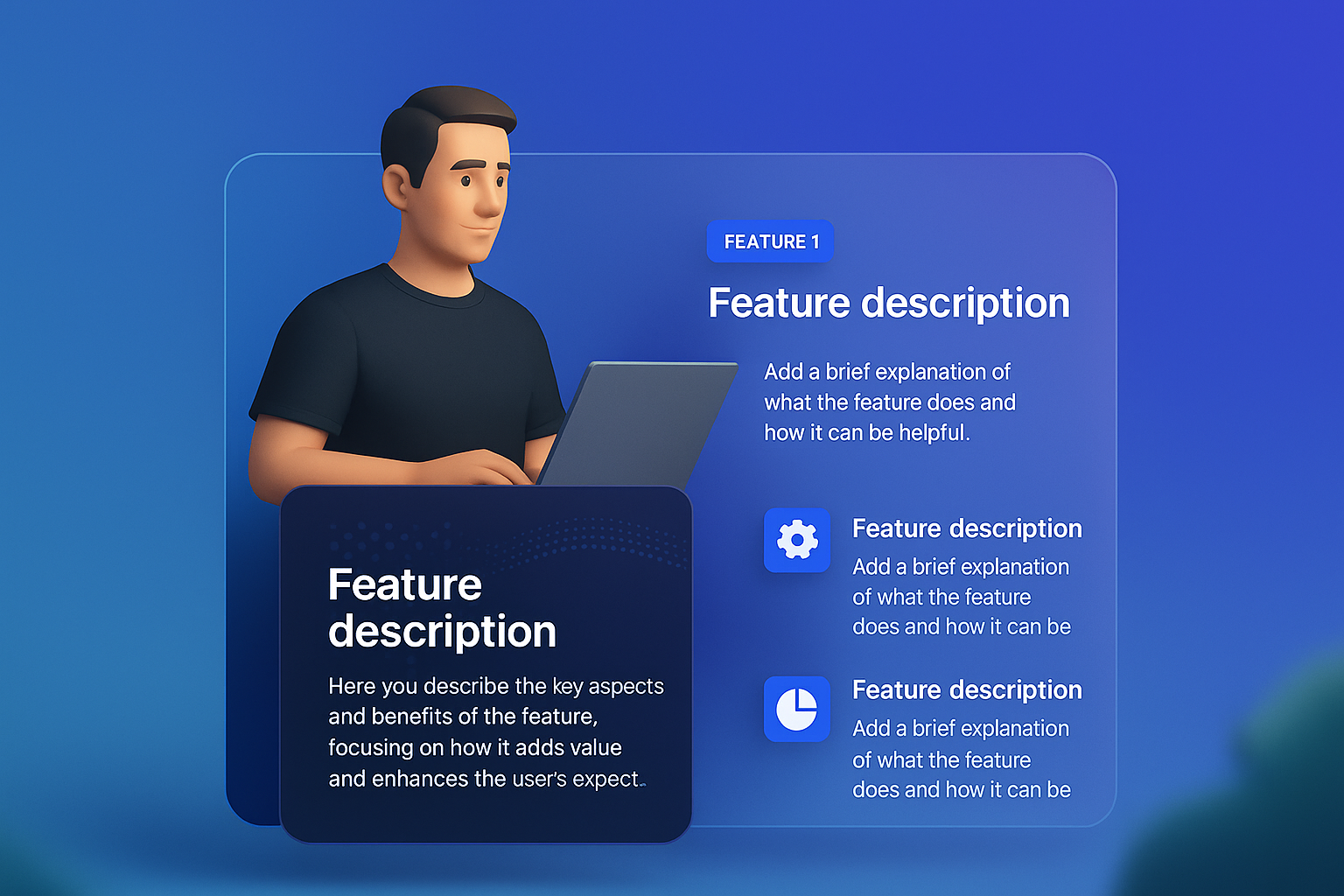 A 3D illustration of a man in a black t-shirt using a laptop, surrounded by a visually appealing layout with feature descriptions and graphics. The design integrates smoothly with a gradient background.