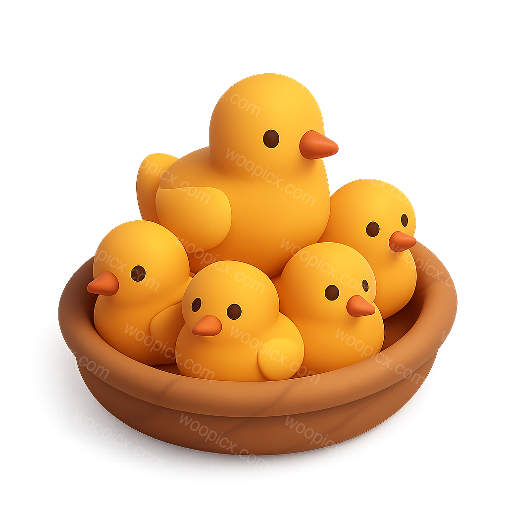 A delightful 3D illustration of a nest containing five cute, yellow ducklings. The design features a soft, volumetric appearance with a warm glow, enhancing its charm.