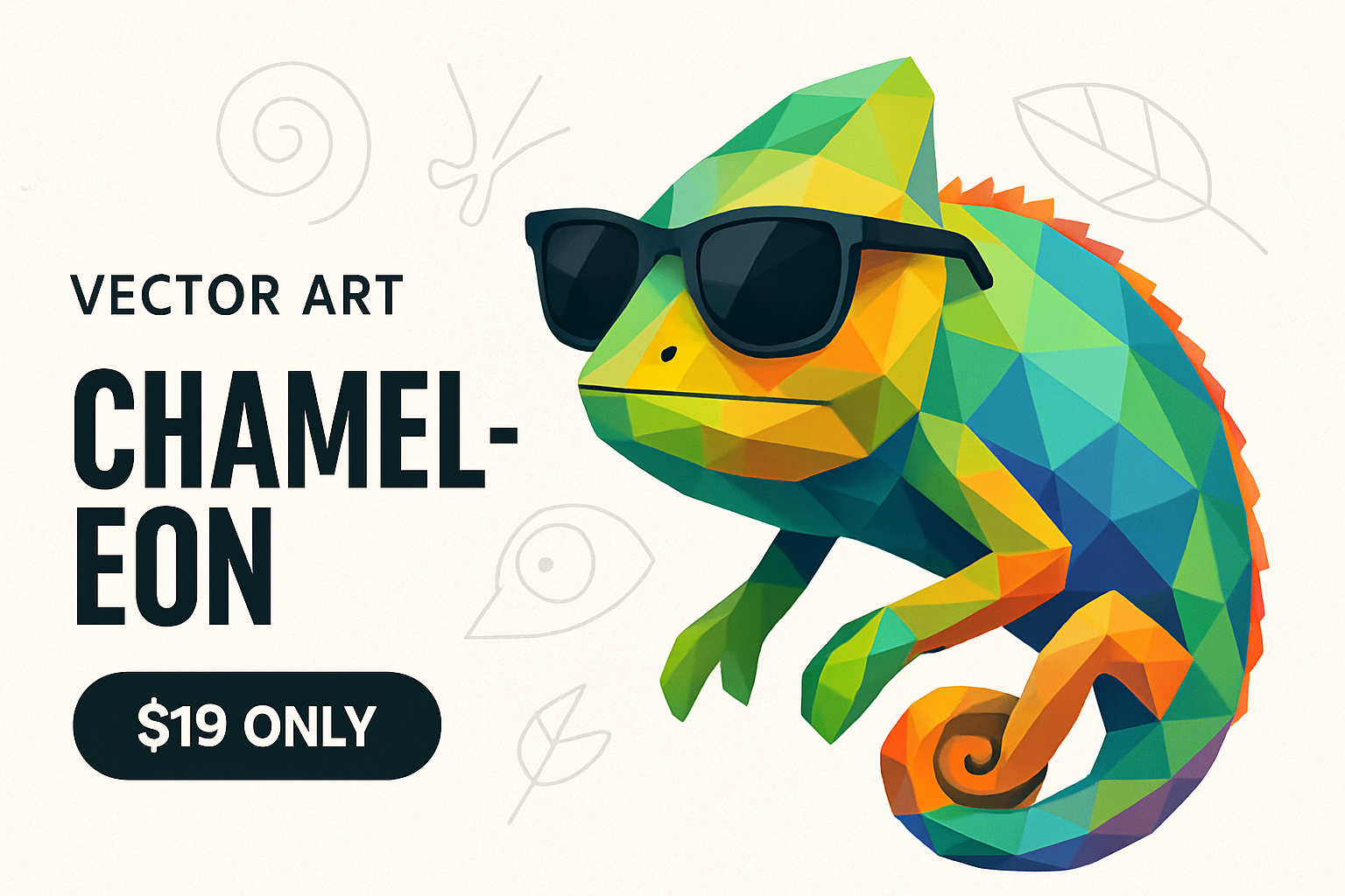 /Collection: /by davooda/Type: PNG/A vibrant chameleon wearing sunglasses is showcased in a minimalistic vector art style. The colorful creature contrasts sharply against a textured white background, featuring simple contour designs.