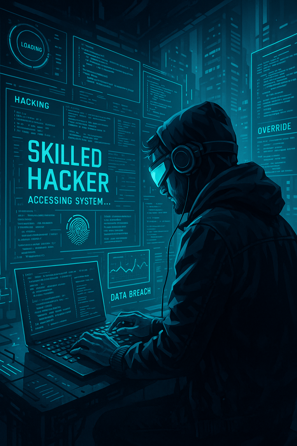 Futuristic Cybersecurity Illustration Featuring a Hacker at Work