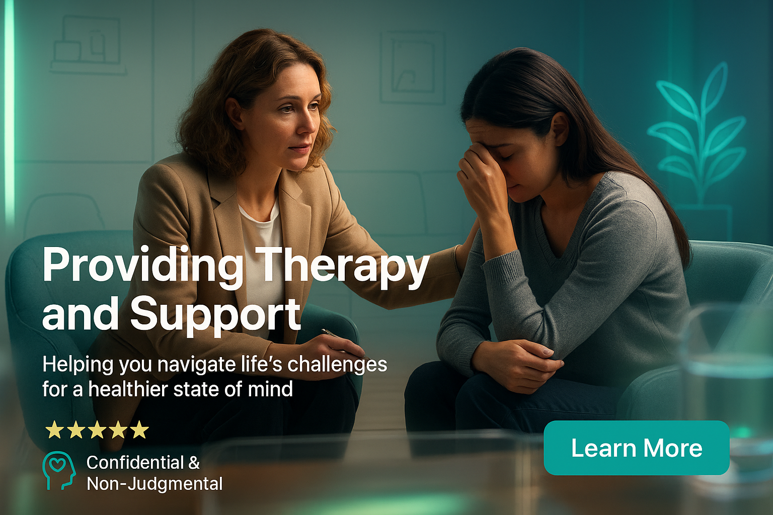 A compassionate therapy scene showcasing a professional providing support to a client, ideal for mental health services marketing.