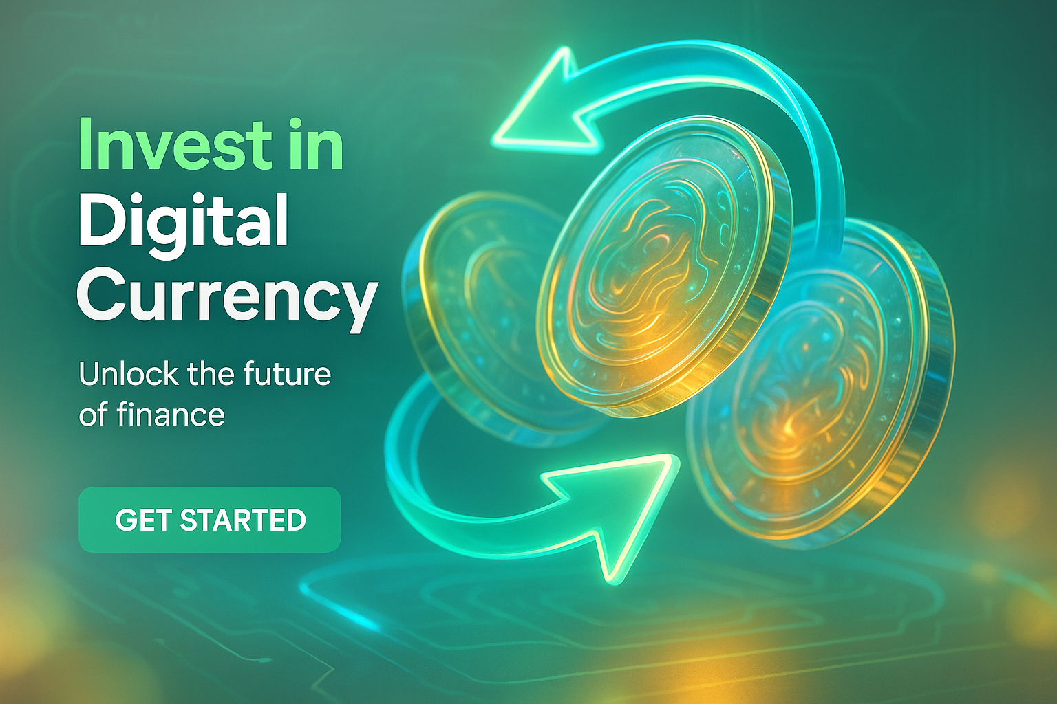 /Collection: /by davooda/Type: PNG/Vibrant promotional graphic showcasing digital currency investment with futuristic design elements. Ideal for financial services marketing to attract tech-savvy investors.