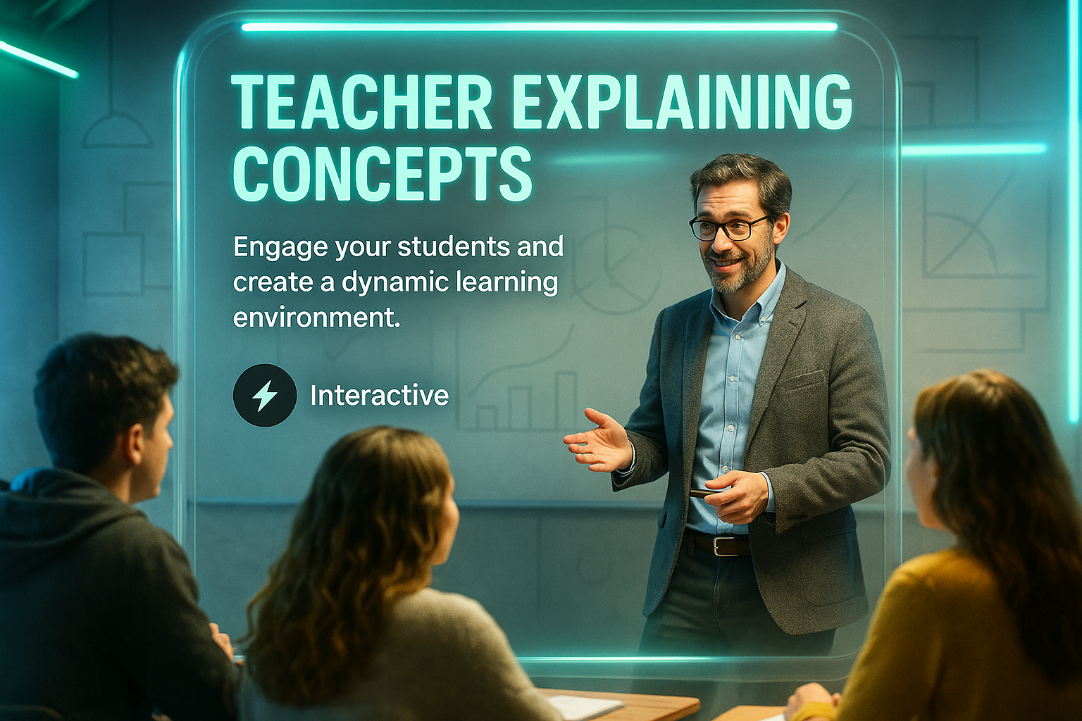 /Collection: /by davooda/Type: PNG/Engaging educational image featuring a teacher explaining concepts to students in a modern classroom setting, designed for promotional or informative educational content.
