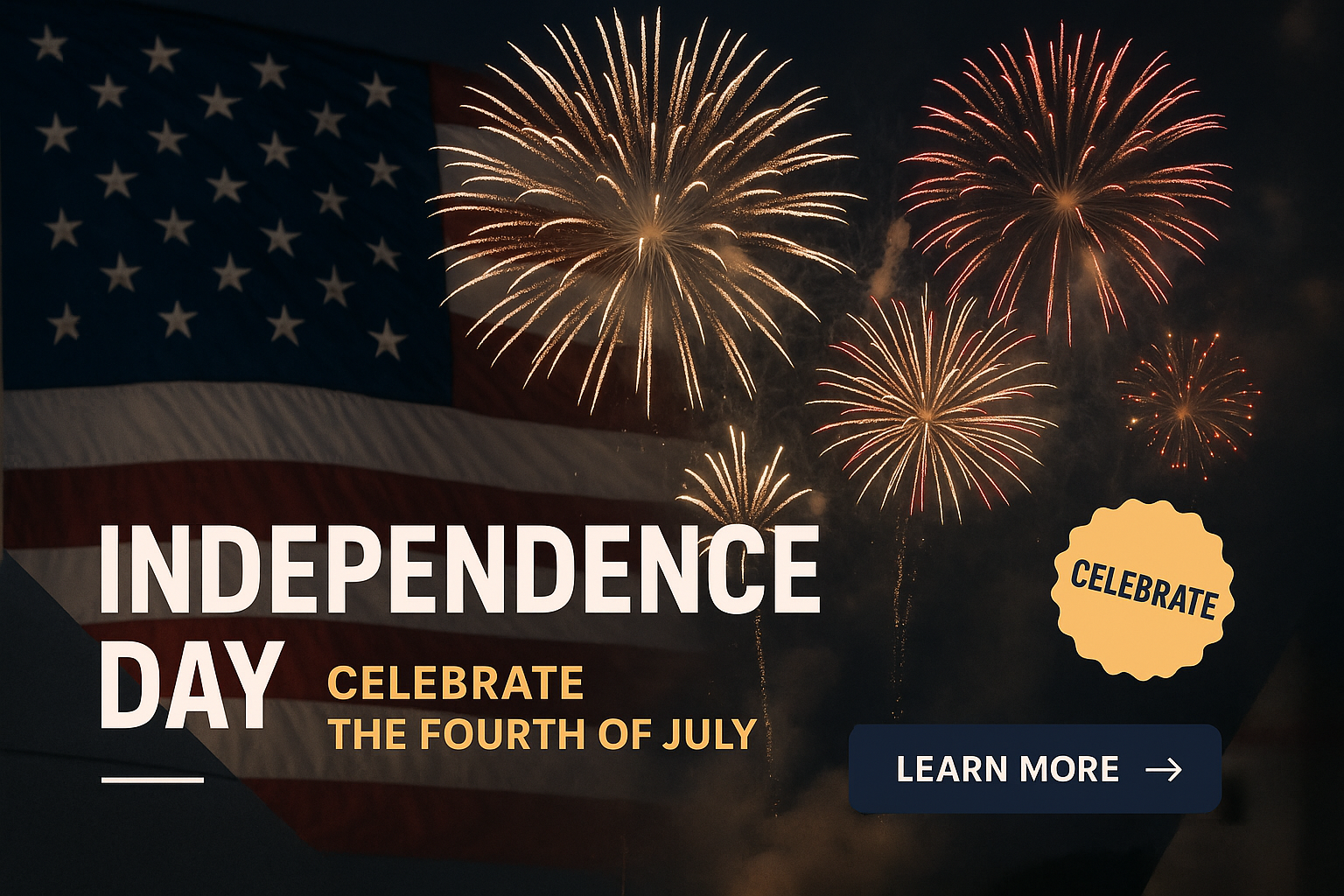 /Collection: /by davooda/Type: PNG/A vibrant display of fireworks bursts above a waving American flag, celebrating Independence Day. The scene features bold typography and a button inviting viewers to learn more.