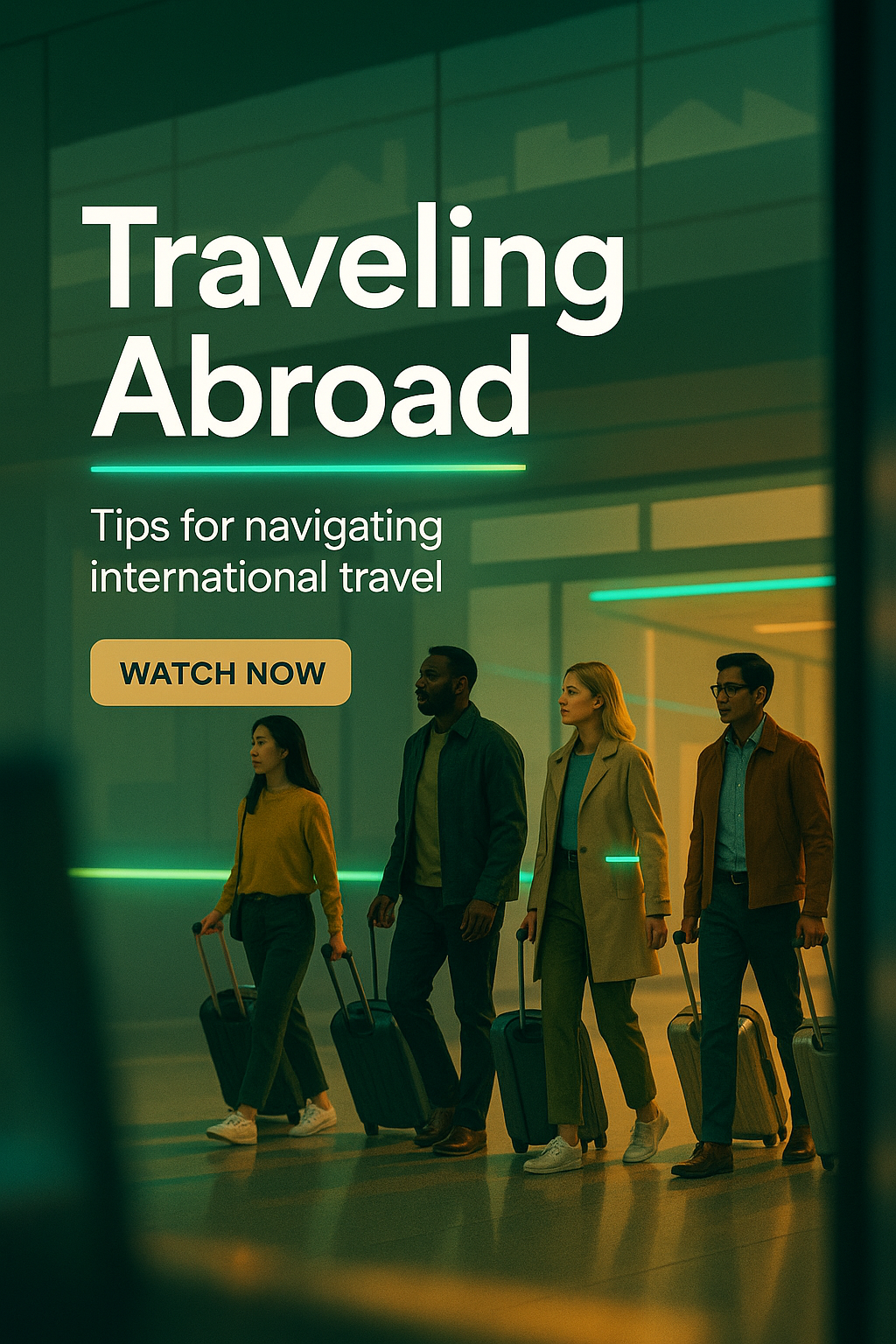 /Collection: /by davooda/Type: PNG/Engaging promotional graphic featuring travelers with luggage, designed to encourage viewers to watch a video on international travel tips. The modern style and vibrant colors enhance its appeal.