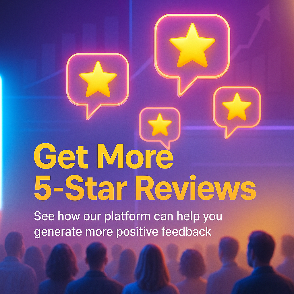 Vibrant promotional image designed to encourage 5-star reviews, featuring glowing star icons and a crowd silhouette, ideal for online marketing campaigns.