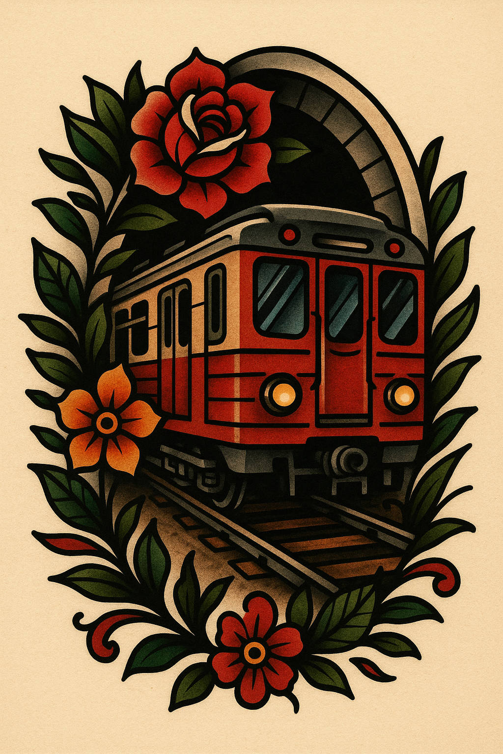 Illustrative Tattoo Design Featuring a Tunnel and Floral Elements