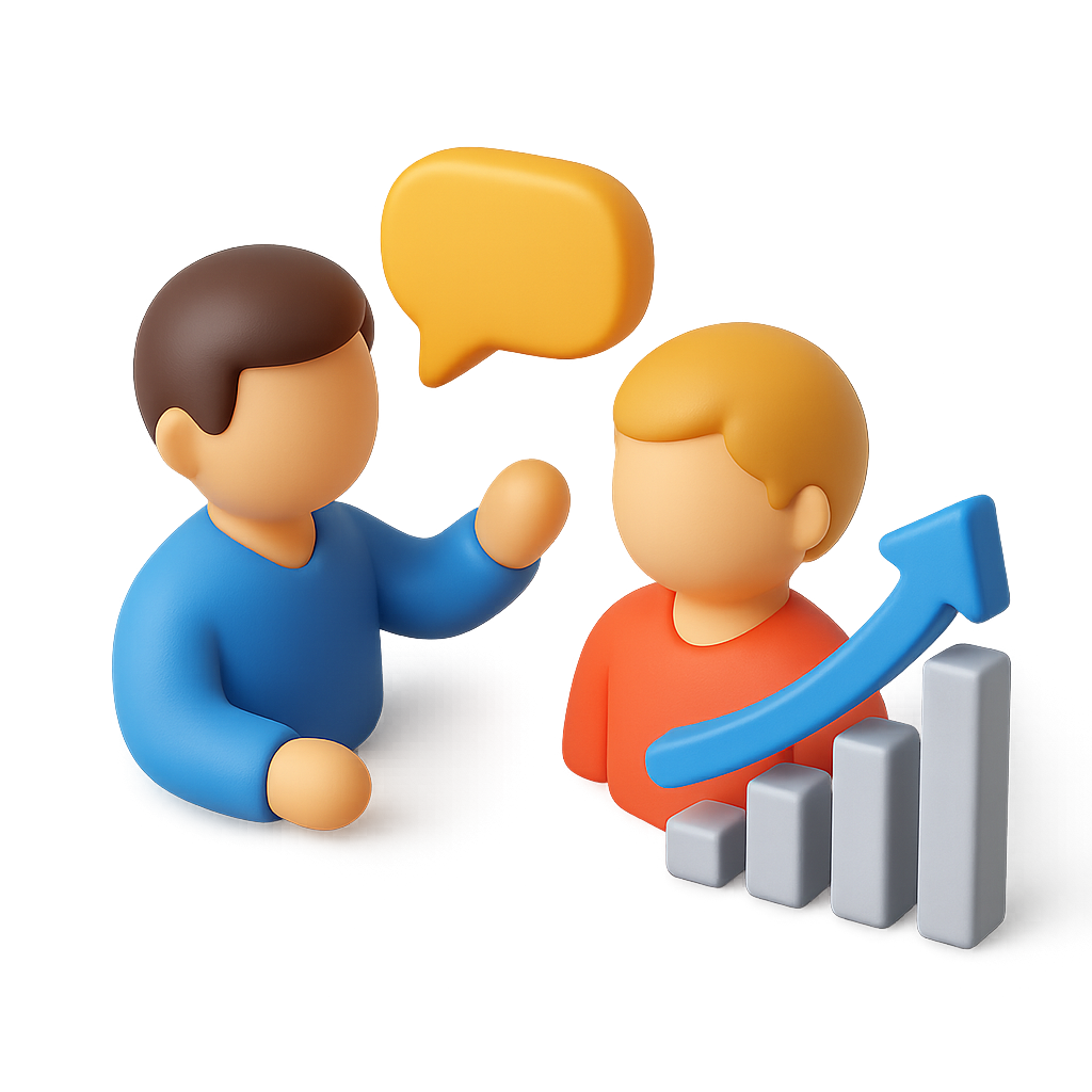 /Collection: /by davooda/Type: PNG/A 3D icon depicting a coaching scenario with two figures engaged in conversation. One figure is gesturing, and an upward graph symbolizes performance improvement.