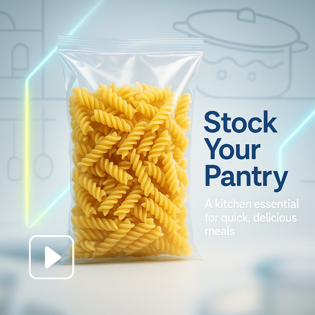 /Collection: /by davooda/Type: PNG/A visually appealing image showcasing a transparent bag filled with spiral pasta, emphasizing the importance of stocking the pantry for quick meals. Ideal for culinary marketing.