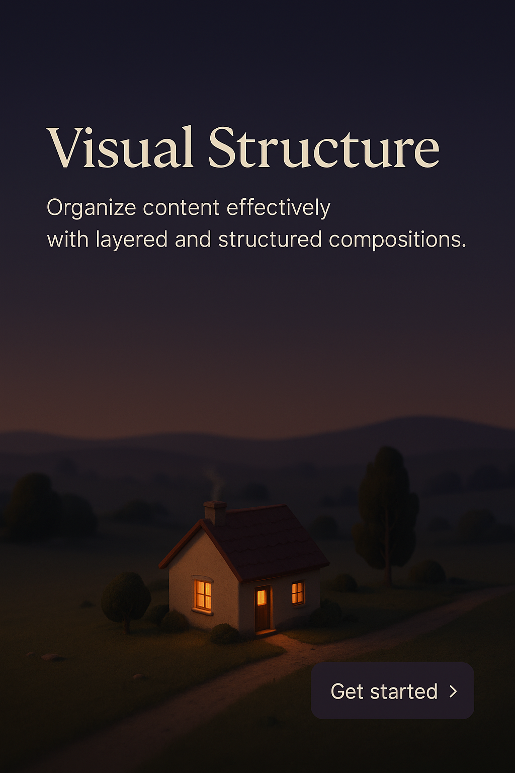 A beautifully designed 3D scene showcasing a small house in a serene landscape, emphasizing layered compositions and effective content organization. The dark gradient background enhances the cozy atmosphere.
