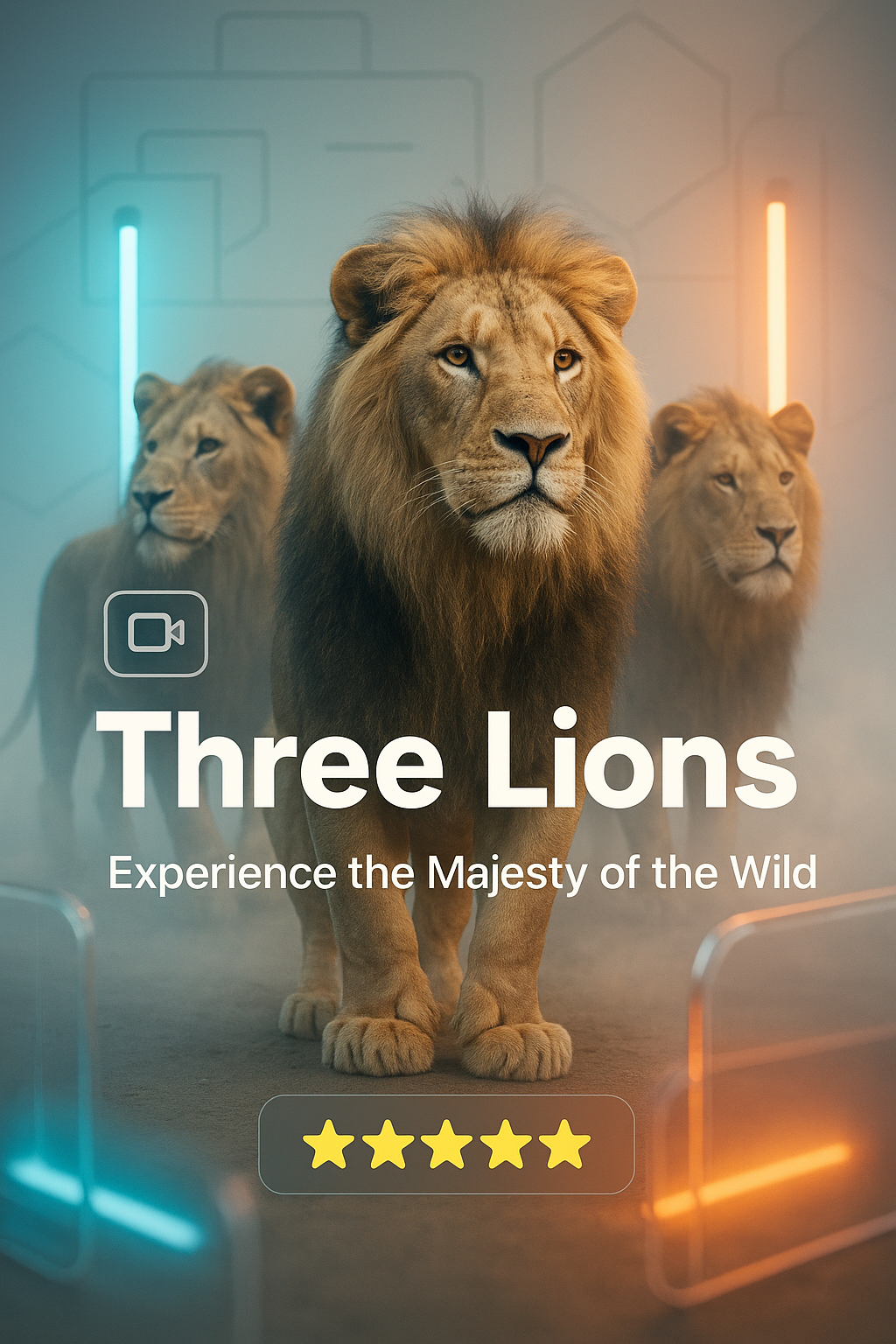 Stunning promotional graphic showcasing three majestic lions in a modern, artistic setting. Ideal for wildlife documentaries or nature-themed content.