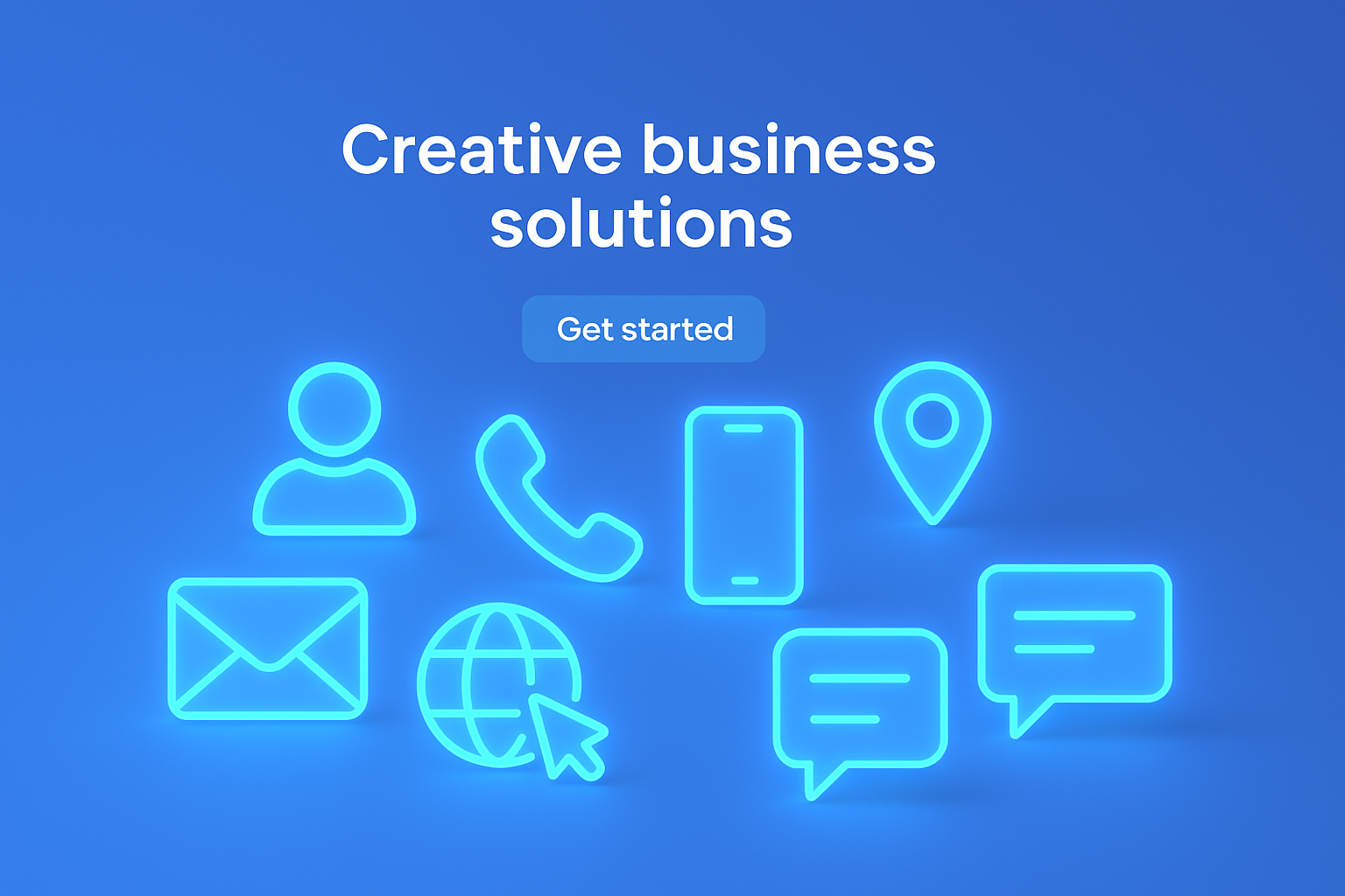 A vibrant blue background showcases glowing icons representing business solutions, including a user, phone, location, and email. The composition features a prominent call-to-action button.