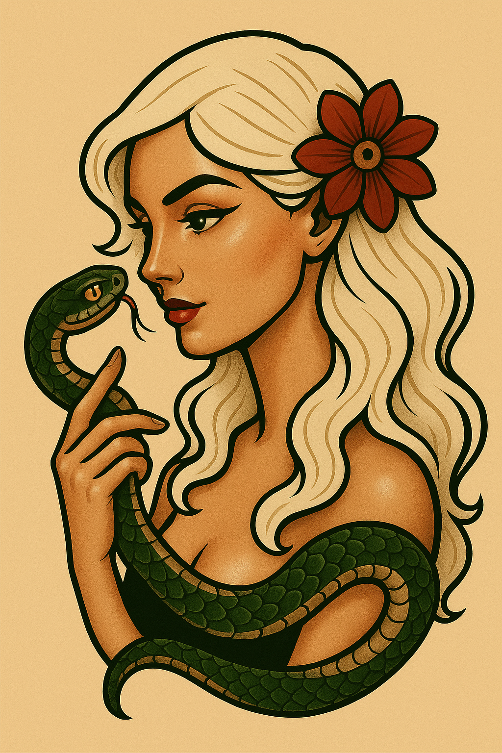 Stylized Tattoo Art of a Woman with a Snake and Rose
