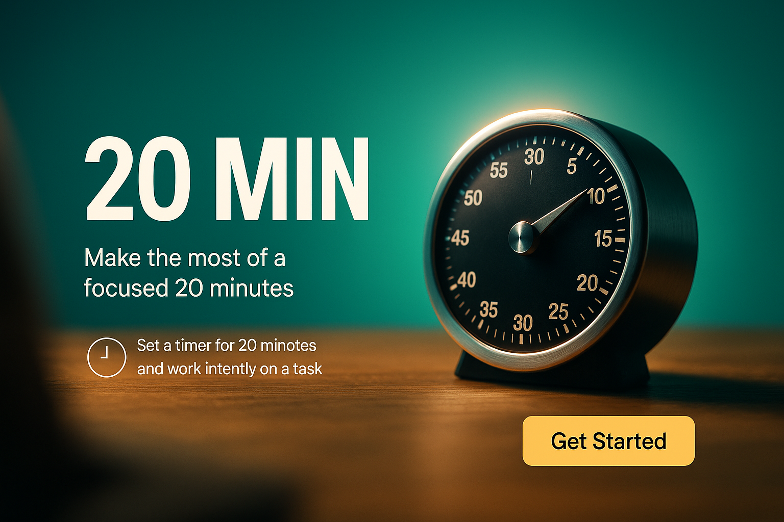 A visually appealing graphic featuring a timer, promoting focused work sessions. Ideal for productivity apps or tools aimed at time management.