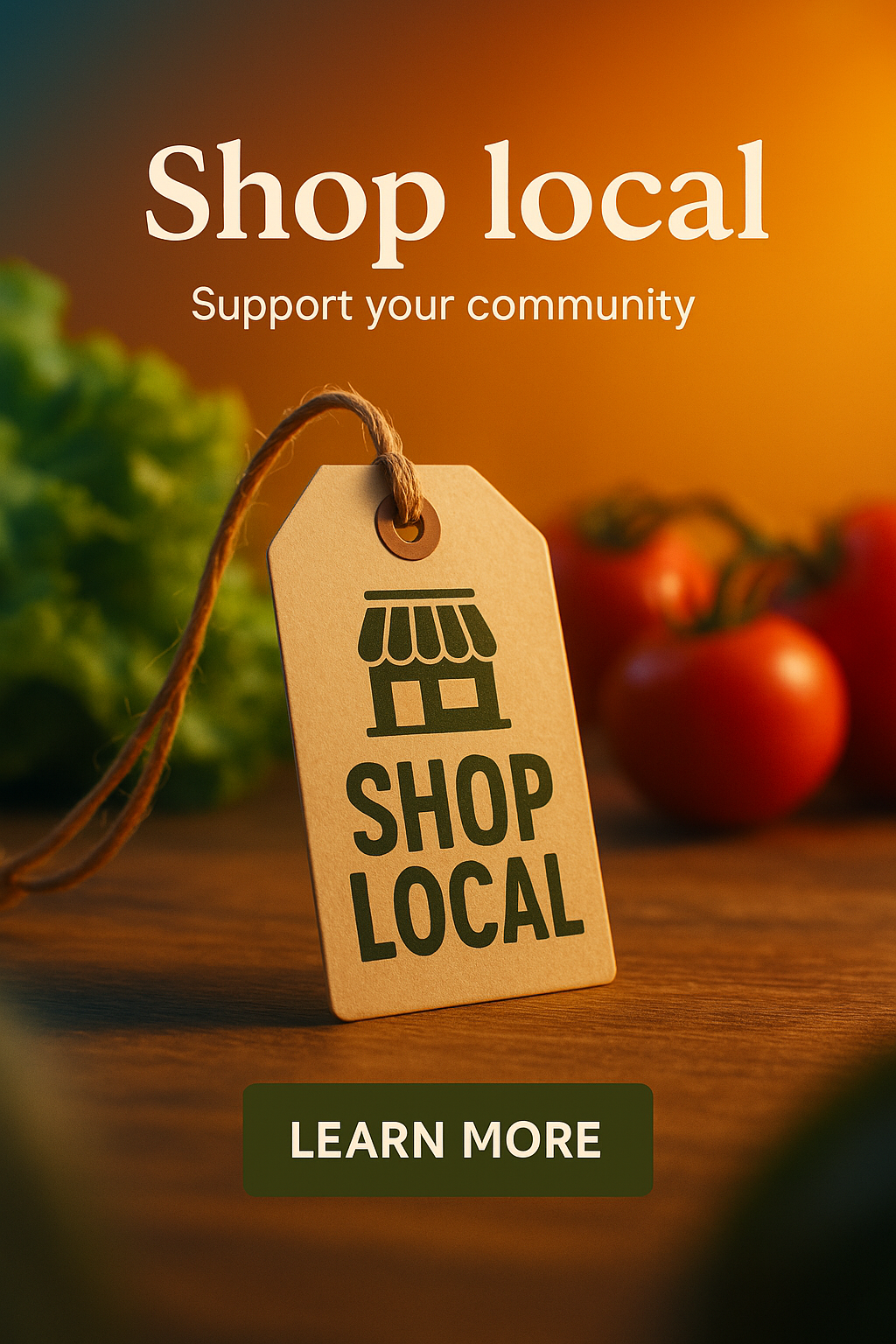 /Collection: /by davooda/Type: PNG/A visually appealing promotional graphic featuring a tag with the phrase 'Shop Local'. It emphasizes community support and local businesses, suitable for social media or marketing materials.