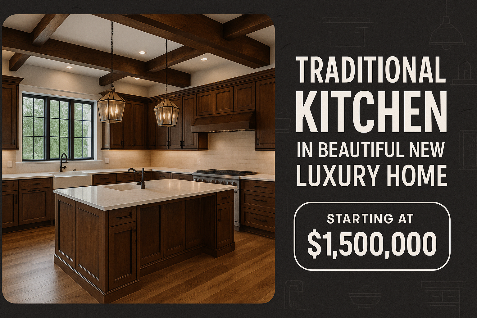 /Collection: /by davooda/Type: PNG/A stunning traditional kitchen showcasing hardwood floors, wood beams, and a large island with quartz counters. Features a farmhouse sink, pendant lights, and large windows, all set in a luxurious home.