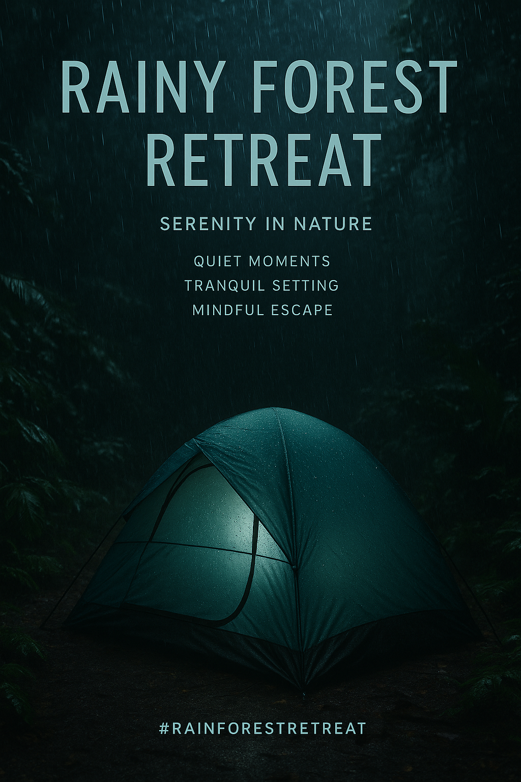 /Collection: /by davooda/Type: PNG/A serene promotional poster for a rainforest retreat featuring a tent under rain, emphasizing tranquility and nature. Ideal for wellness and travel marketing.
