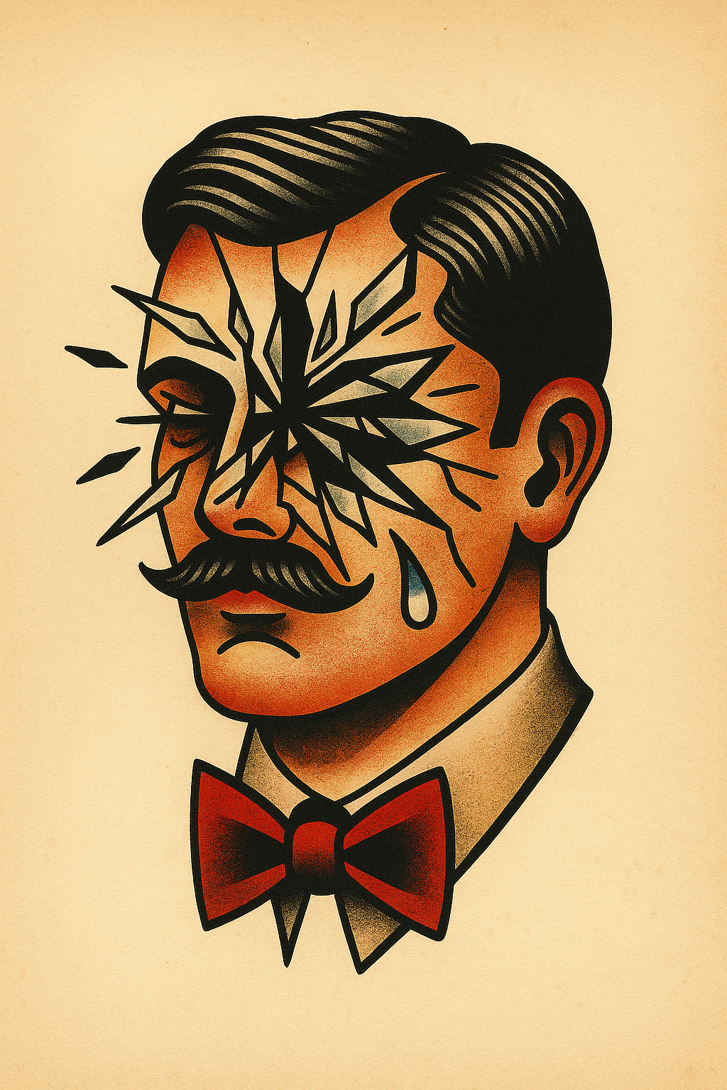 /Collection: /by davooda/Type: PNG/A striking tattoo design depicting a man's face with a shattered glass effect, showcasing vibrant colors against a soft beige background. The character has a mustache and a tear, enhancing the emotional impact.