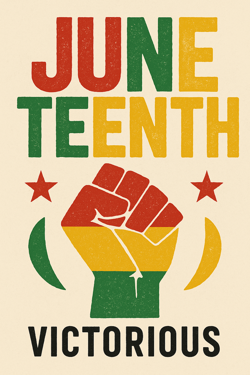 Vibrant graphic design celebrating Juneteenth with a raised fist symbol, embodying strength and resilience. Ideal for social media posts and community events.