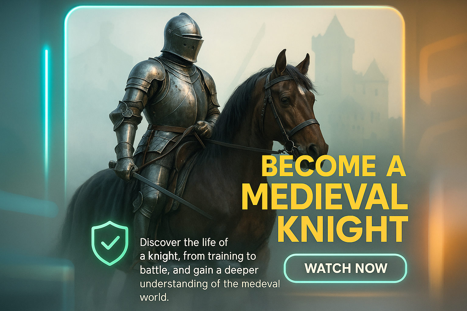 /Collection: /by davooda/Type: PNG/Engaging promotional image showcasing a knight on horseback, designed to attract viewers to a medieval experience. The modern aesthetic combines historical themes with vibrant colors.