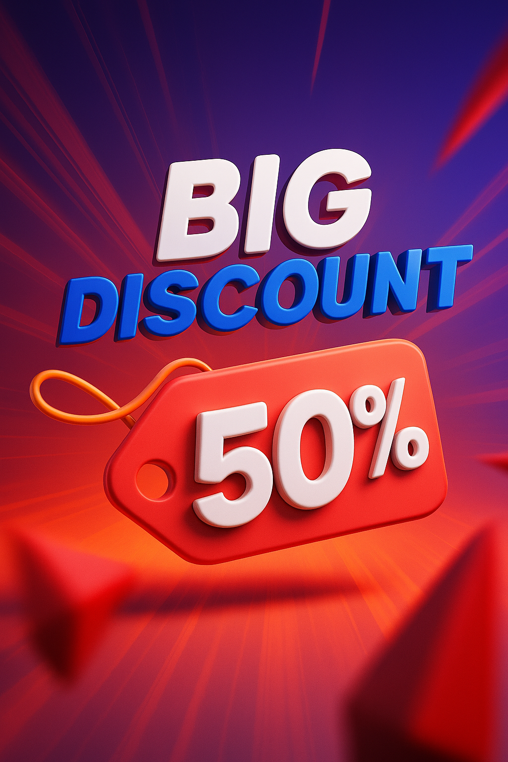/Collection: /by davooda/Type: PNG/A vibrant 3D illustration showcasing a bold 'BIG DISCOUNT' headline and a prominent '50%' tag, set against a dynamic gradient background with energetic lines radiating outward.