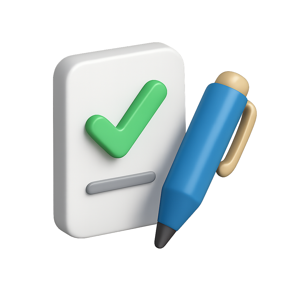 A 3D icon featuring a document with a green checkmark and a blue pen. The design is isometric with a transparent background, creating a modern and volumetric appearance.