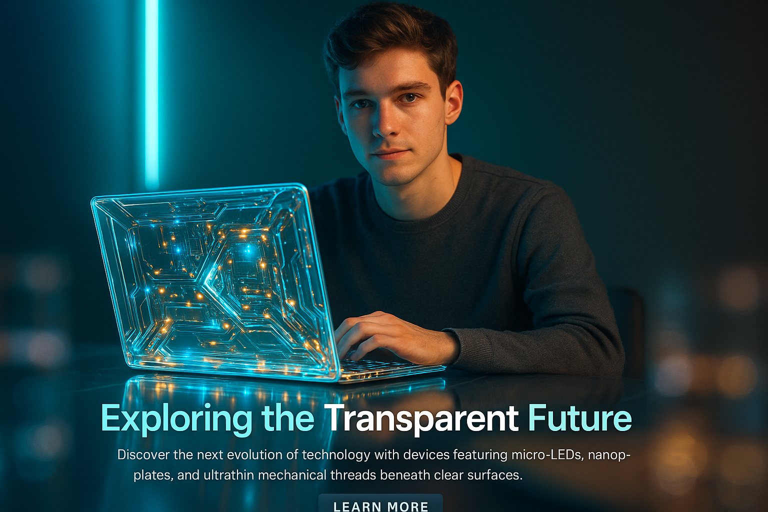/Collection: /by davooda/Type: PNG/A young man sits in a cafe, focused on his laptop. The scene features an abstract background and a futuristic design with glowing elements and a transparent laptop, creating a high-tech ambiance.