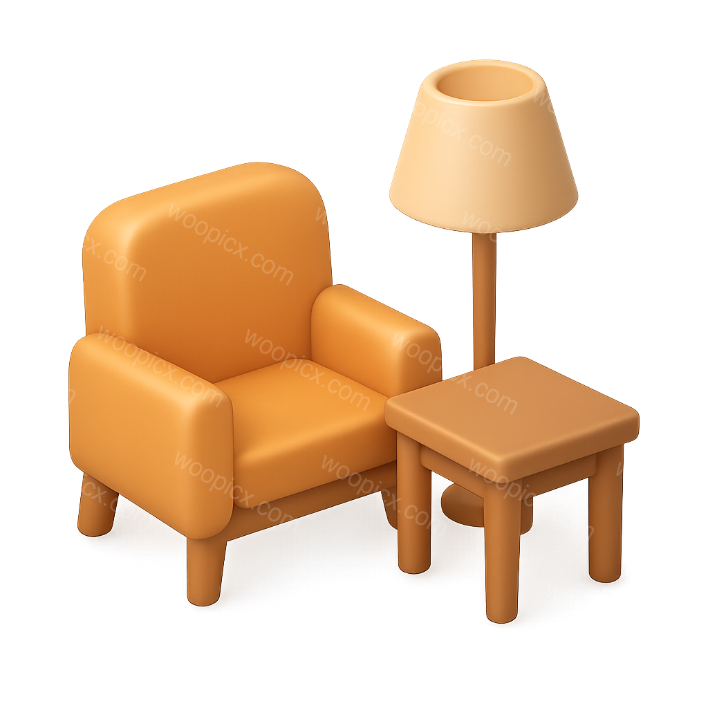 /Premium/Collection: /by davooda/Type: PNG/A stylized 3D isometric illustration featuring a soft orange chair, a matching table, and a lamp. The design emphasizes a volumetric feel with a transparent background.