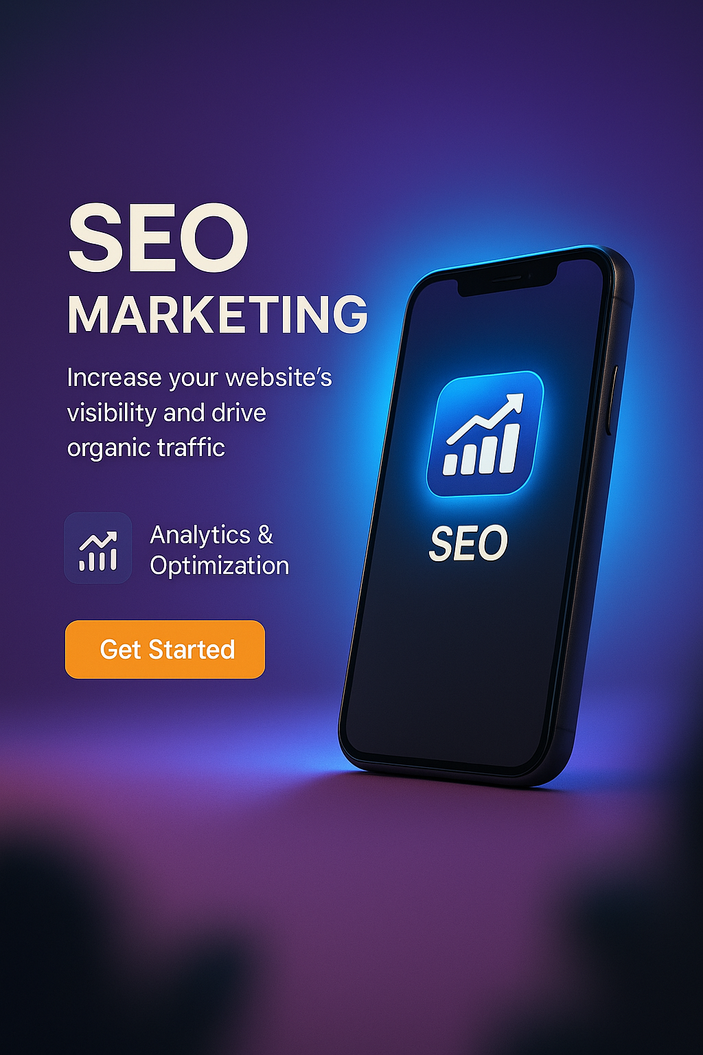A digital marketing graphic focused on SEO services, featuring a mobile device with an analytics-themed design. Ideal for social media or website promotion.