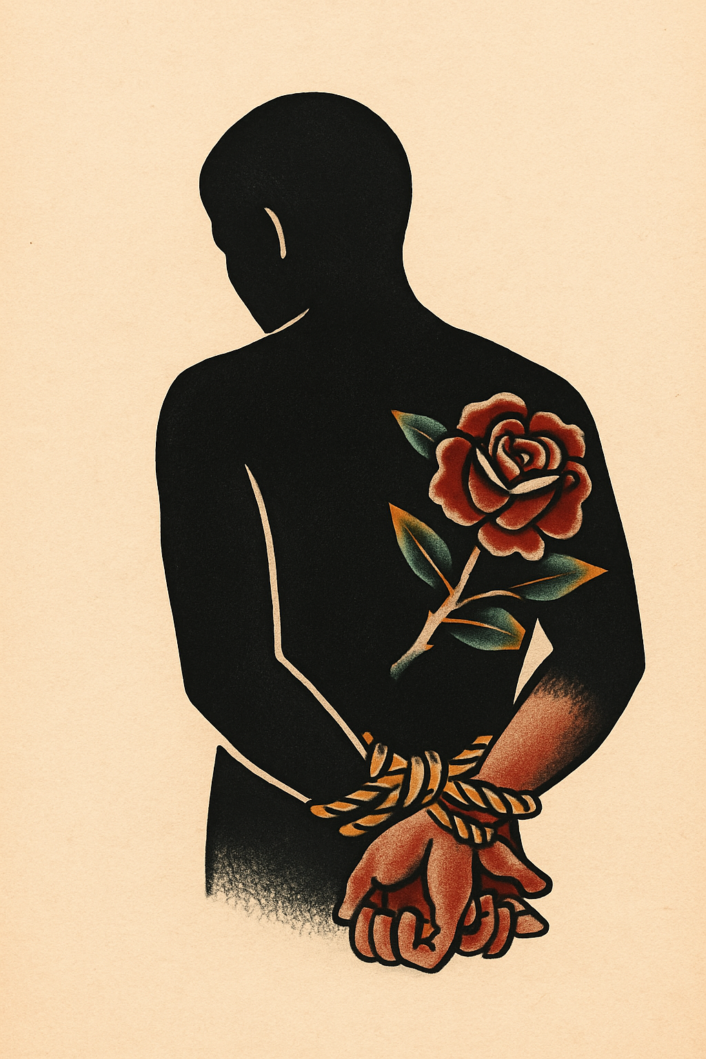 /Collection: /by davooda/Type: PNG/A striking silhouette of a person with their hands bound, featuring a colorful rose tattoo on the back. The artwork is set against a soft beige backdrop, emphasizing the tattoo's intricate design.