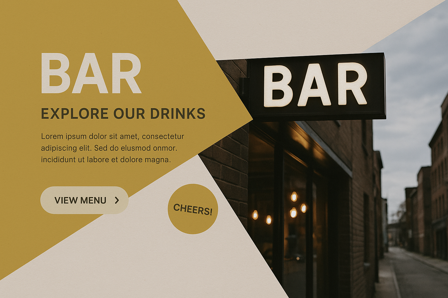 A visually striking bar advertisement featuring geometric shapes and a realistic photo backdrop. The design includes a prominent sign, call-to-action button, and a stylish color scheme.