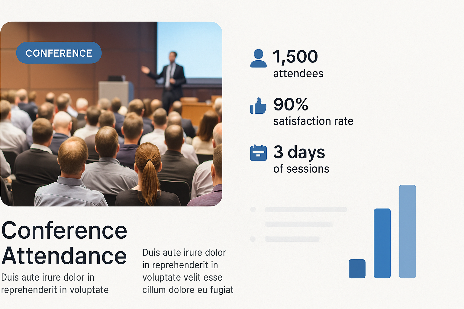/Collection: /by davooda/Type: PNG/Informative infographic showcasing key statistics about a conference, featuring a speaker in front of an engaged audience, ideal for event promotion and analysis.