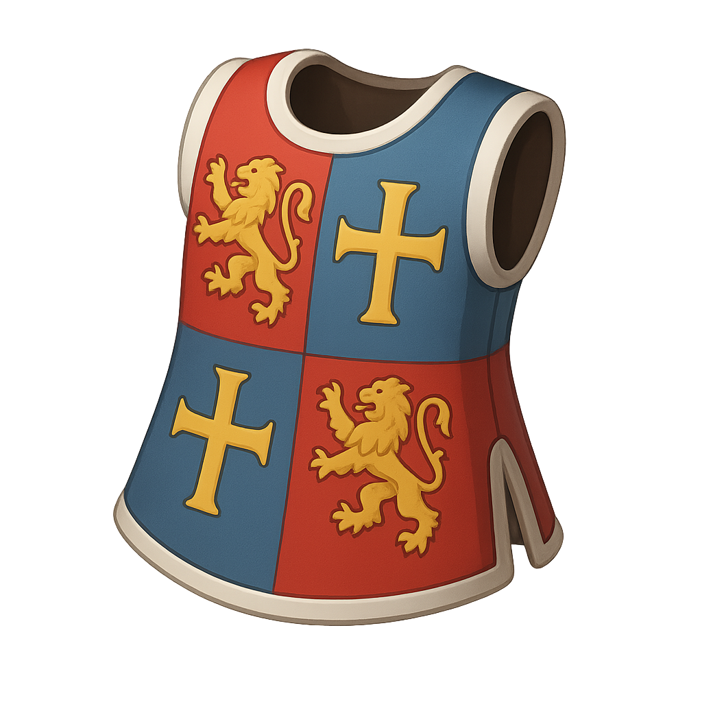 This image features a stylized 3D shield or vest icon, adorned with a vibrant design of lions and crosses in red, blue, and gold colors, showcasing medieval aesthetics.