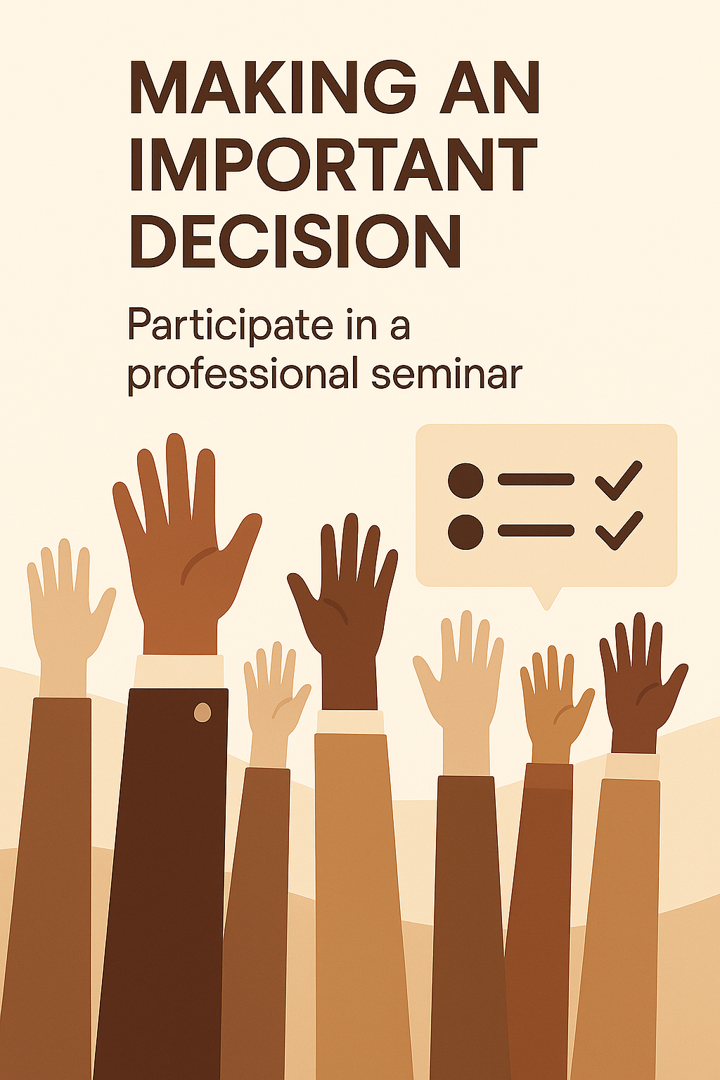 Visually appealing graphic promoting participation in a professional seminar, featuring raised hands and a speech bubble, ideal for event marketing.