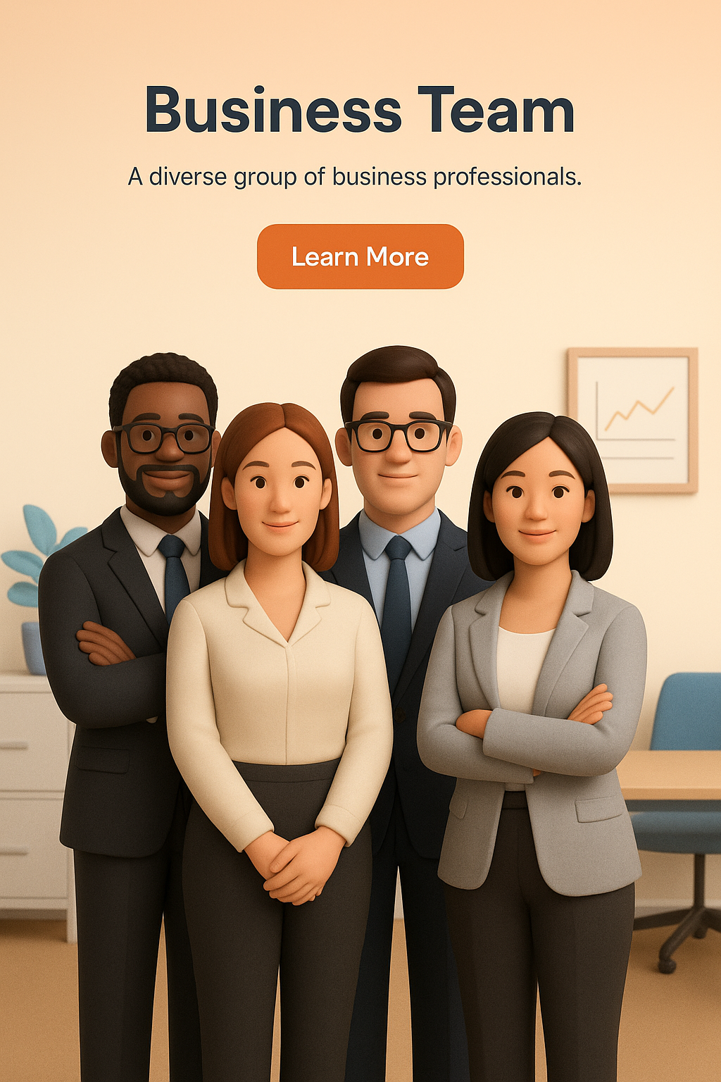 /Collection: /by davooda/Type: PNG/A diverse group of business professionals stands confidently in a modern office. The illustration features a smooth gradient background and includes a call-to-action button.